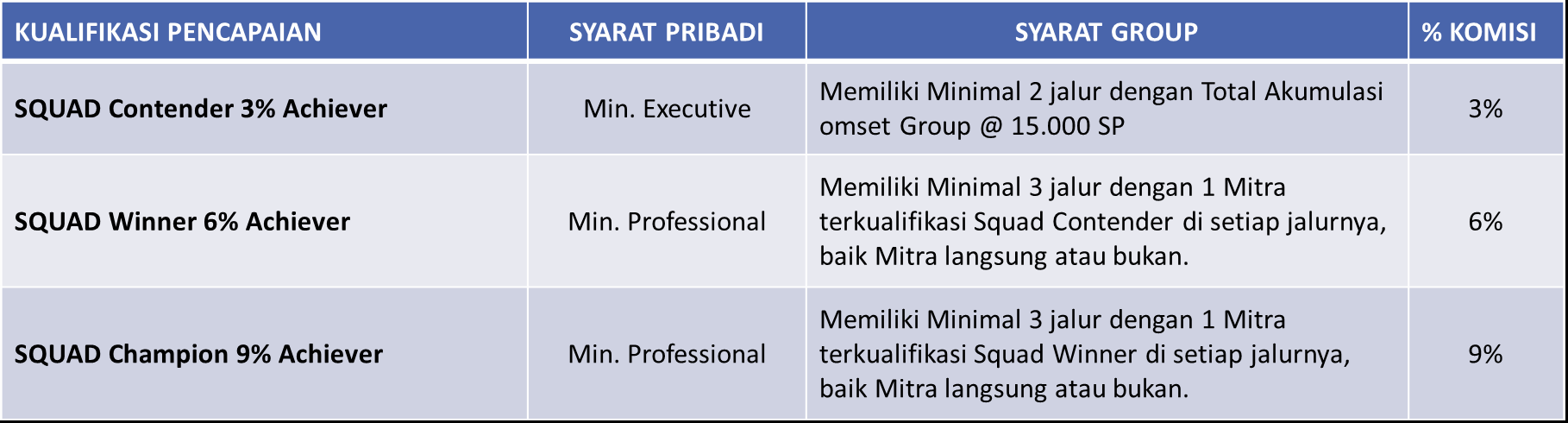 Sejahtera (SQUAD) kepada Mitra Squad, berdasarkan target penjualan produk secara